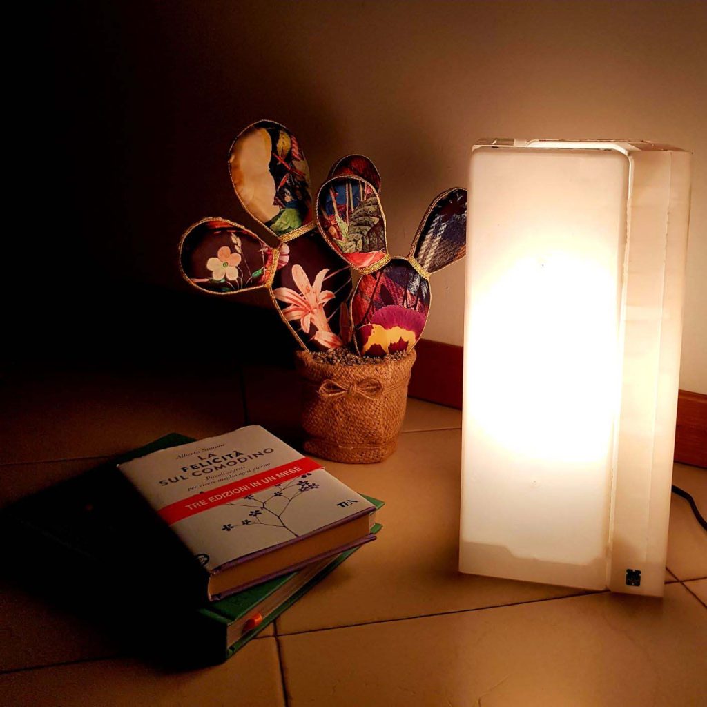 Le grandi cartucce in plastica, svuotate delle sacche di inchiostro e incollate tra loro diventano una lampada. La lampada può essere usata senza staccare le etichette che ne rivelano la propria identità e che danno a questo oggetto il fascino di poter raccontare una storia , una storia che parte dalla sua fabbricazione, al viaggio nel mondo che ha fatto la cartuccia, al luogo dove è stata usata e al servizio che ha reso in un ambiente specifico, al suo recupero ed infine al suo upcycling che ne allunga ulteriormente la vita dando una nuova funzione e una nuova storia.